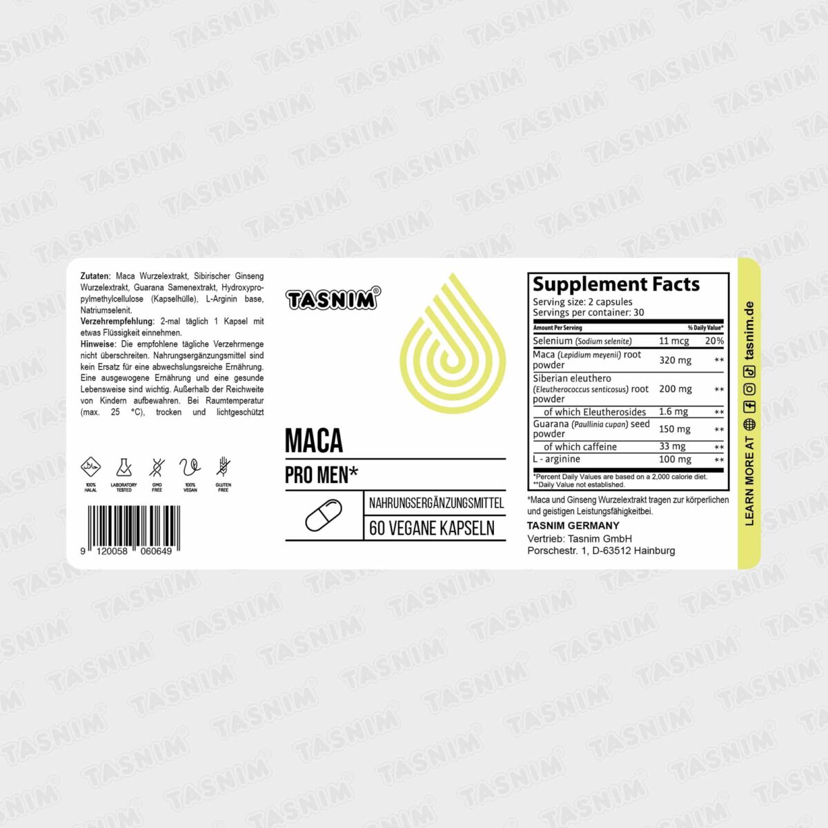 Tasnim Maca Kapseln sind ein hochwertiges, natürliches Nahrungsergänzungsmittel aus der traditionsreichen Maca-Wurzel (Lepidium meyenii), angereichert mit pflanzlichen Extrakten aus Ginseng, Guarana und der Aminosäure L-Arginin. Die Kombination dieser Inhaltsstoffe wurde entwickelt, um die körperliche Leistungsfähigkeit, Vitalität und das allgemeine Wohlbefinden zu unterstützen.