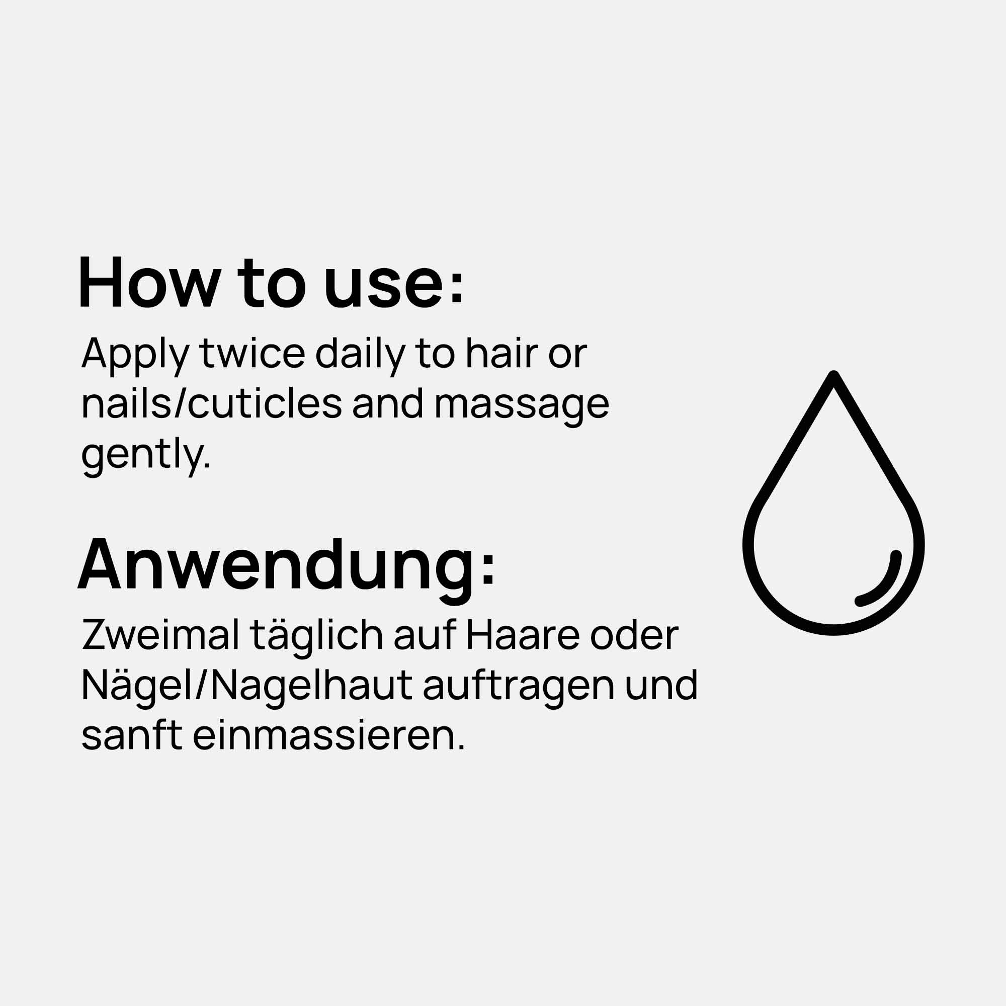 Zweimal täglich sparsam auf die betroffenen Stellen – wie Haare, Nägel oder Nagelhaut – auftragen und sanft einmassieren.